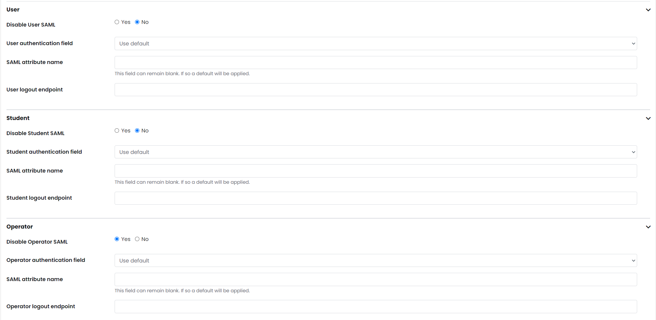 The final section focuses on settings related to specific user types (Custom Users, Students and Operators):