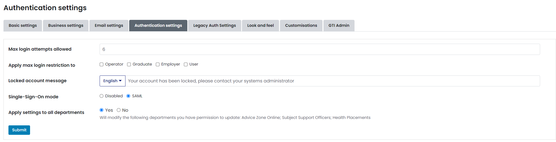Please note the 'Apply settings to all departments' section. If you have multiple partitions, and some of them are not listed in the help text, then you will need to setup the SSO integration individually on the missing partitions, or amend your operator permissions to have access to all partitions.
