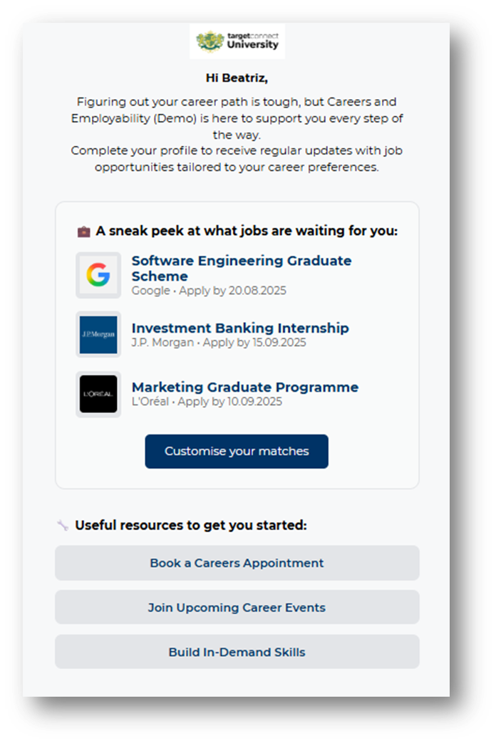 The Engagement Prompt is a new automated email feature in targetconnect designed to help careers teams reconnect with students who haven’t yet engaged with the career service through your targetconnect platform. This article explains how the prompt works, how to activate it, and how it can support early student engagement with opportunities and events.